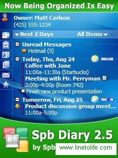 Spb Diary — это многофункциональный экранный модуль для вашего календаря, задач, контактов, заметок и сообщений. Spb Diary облегчает работу с программой Pocket Outlook, собирая вместе все ваши PIM-данные. Пользуясь программой Spb Diary каждый день, вы скоро заметите, что вам практически не нужно покидать экран «Сегодня» для совершения большинства обычных действий.