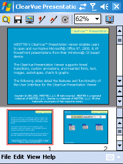 Westtek LLC ClearVue Suite Professional - программа для просмотра на КПК документов различных форматов - презентаций, Word, Excel, PDF и просмотра картинок. В отличие от остальных продуктов, ClearVue смотрелки не требуют конверторов и фильтров. Документы принимаются как есть. ClearVue Suite поддерживает переходы, анмацию, вставленные текст, шрифты, картинки, графики и диаграммы.