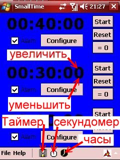 ![]() SmallTime очень маленькая программа кторая содержит три независимых секундомера, три таймера и одни часы. Таймеры работают независимо друг от друга программируются на разное время и работают на выключенном КПК дальше. Каждый из них может иметь свой сигнал Совместимость:WM2003-WM6 Скачать ЗДЕСЬ |