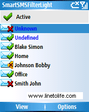 SmartSMSFilter Light - это маленькая и простая в использовании программа, которая позволяет вам контролировать ваши входящие СМС сообщения. Любому контакту из записной книжки вы можете назначить одно из трёх действий для входящих СМС: 1) принимать СМС подавая звуковой сигнал (нормальный режим), 2) принимать СМС без подачи звукового сигнала, 3) Запретить СМС. Эти действия также могут быть назначены всем контактам, которых нет в вашей записной книжке