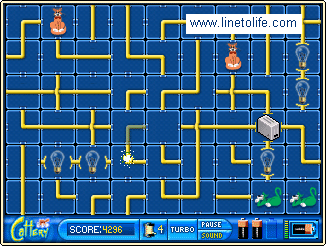 By bending electrical wires you have to switch on all of the lamps on the game field and save all of the cats. You can pass a lamp only once. On fast and successful passing through every doubled levels, you get an additional Bonus level where you can make extra points by switching electrical devices. But you can keep all collected points only in case you have lighted all of the lamps and preserved your life (battery). At the begging of the game you receive 3 lives (batteries). Passing 6 levels grants you extra lives (batteries).