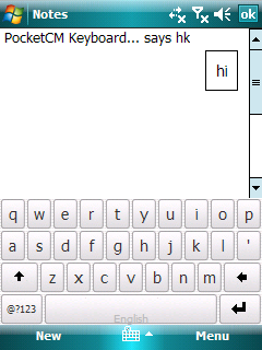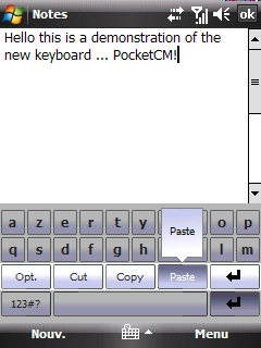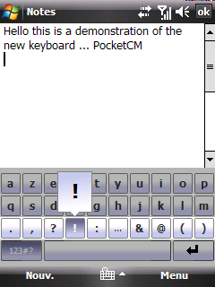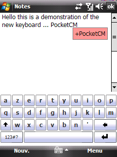 PocketCM Keyboard - виртуальная клавиатура для набора текста пальцами. Поддерживает автоподбор слов, в зависимости от уже набранных букв. "Нажатие" клавиши происходит когда пользователь отрывает палец от экрана, а не в начале прикосновения, то есть у вас есть возможность перемещать палец, если вы ошиблись буквой. При этом используются стандартные инструменты для Windows Mobile, таким образом, эта клавиатура может использоваться почти в любых приложениях. По умолчанию используется QWERTY-раскладка, изменить её можно просто отредактировав один текстовый файл.