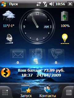 ![]() Отображение "Баланса" на экране "Сейчас-профи". QVGA, портрет. Обновление баланса с помощью программы MVBalance. Установка: .CAB файл --> софтресет (ярлыки Start & Stop также работают). Перед установкой, желательно сохранить родной файл "qa_layouts.dat". После удаления темы - вернуть его на место. Устанавливается в ту же папку, что и версия 2.0 и с ней не конфликтует (возможен переход туда-сюда без переустановки). Возможны сбои при установке из-за конфликта уже установленной программы MortScript и устанавливаемой. В этом случае придётся перед установкой почистить реестр, удалив следующие ветки: HKCR.mortrun HKCR.mscr HKCR.MortScript HKCU.SoftwareMort Для правильного отображения, формат виджета должен быть "Текстовый" (по умолчанию). Номер запроса по умолчанию *102#. Изменить номер можно в ручную, в файле "Program Files/Spb Mobile Shell/BalansBalanc.exe.ini" В виду того, что сама программа запроса баланса изначально не расчитана на работу совместно с SPB Mobile Shell, возможна некоторая нестабильность в работе данного "плагина". Системные требования: WM2002 - WM6.1 Дополнительные требования: Нет данных Разрешение экрана: QVGA (240x320) Тип установки: CAB Shell Balance 3.0.1 |