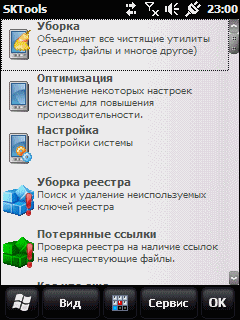SKTools - позволяет чистить файловую систему и реестр КПК, работать с базами данных, оптимизировать настройки системы и многое другое. Утилита находит и удаляет ненужные временные файлы и папки, историю ссылок IE, копии файлов и.т.п. Также программа позволяет работать с картами памяти - форматирование карт, удаление данных. Программа показывает список установленных программ с указанием занимаемого места и времени установки. Имеются широкие возможности удаления программ.